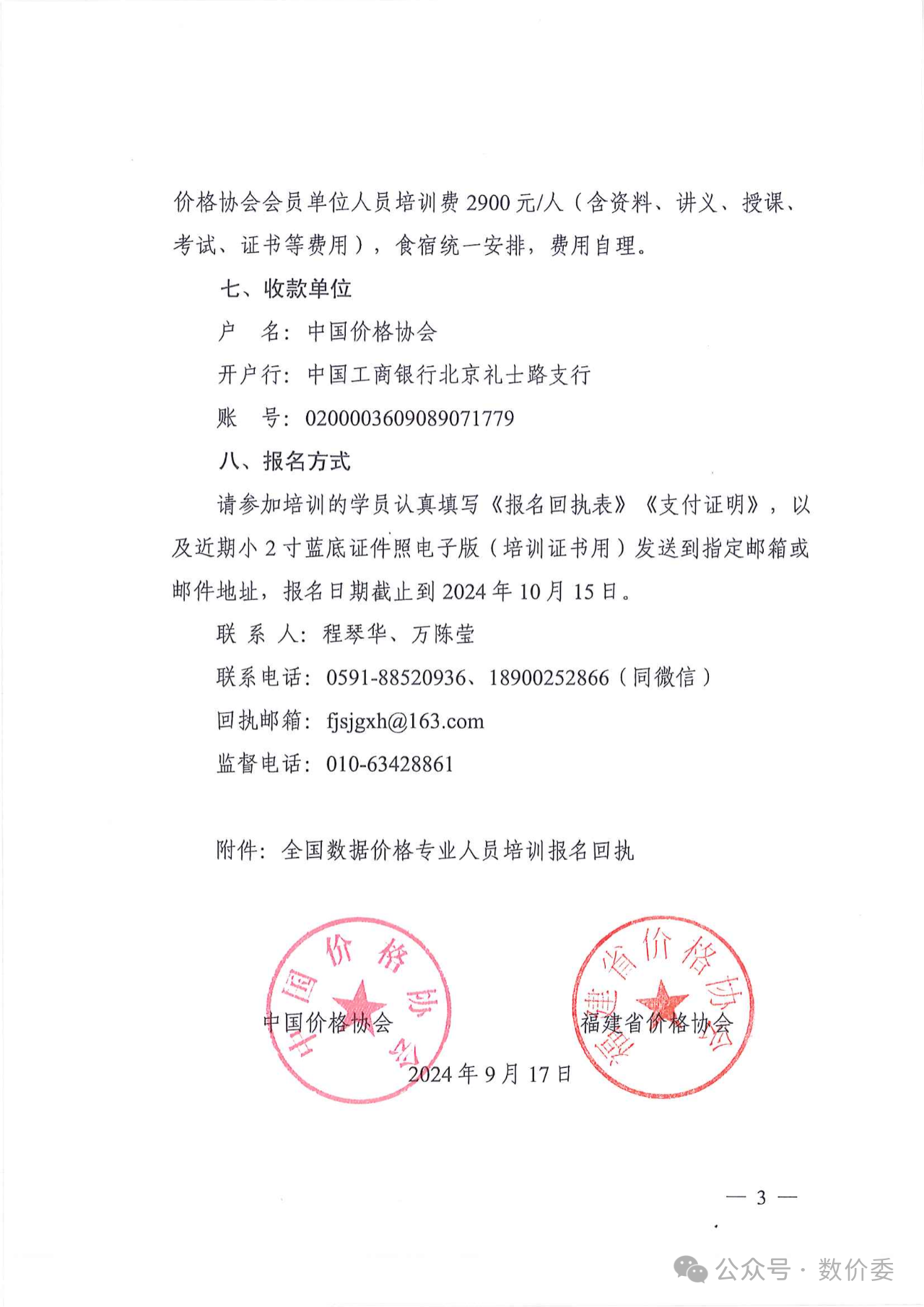 數據價格專業人員培訓費3700元/人,中國價格協會及福建省價格協會會員單位人員培訓費2900元/人(含資料、講義、授課、考試、證書等費用),食宿統一安排,費用自理。七、收款單位